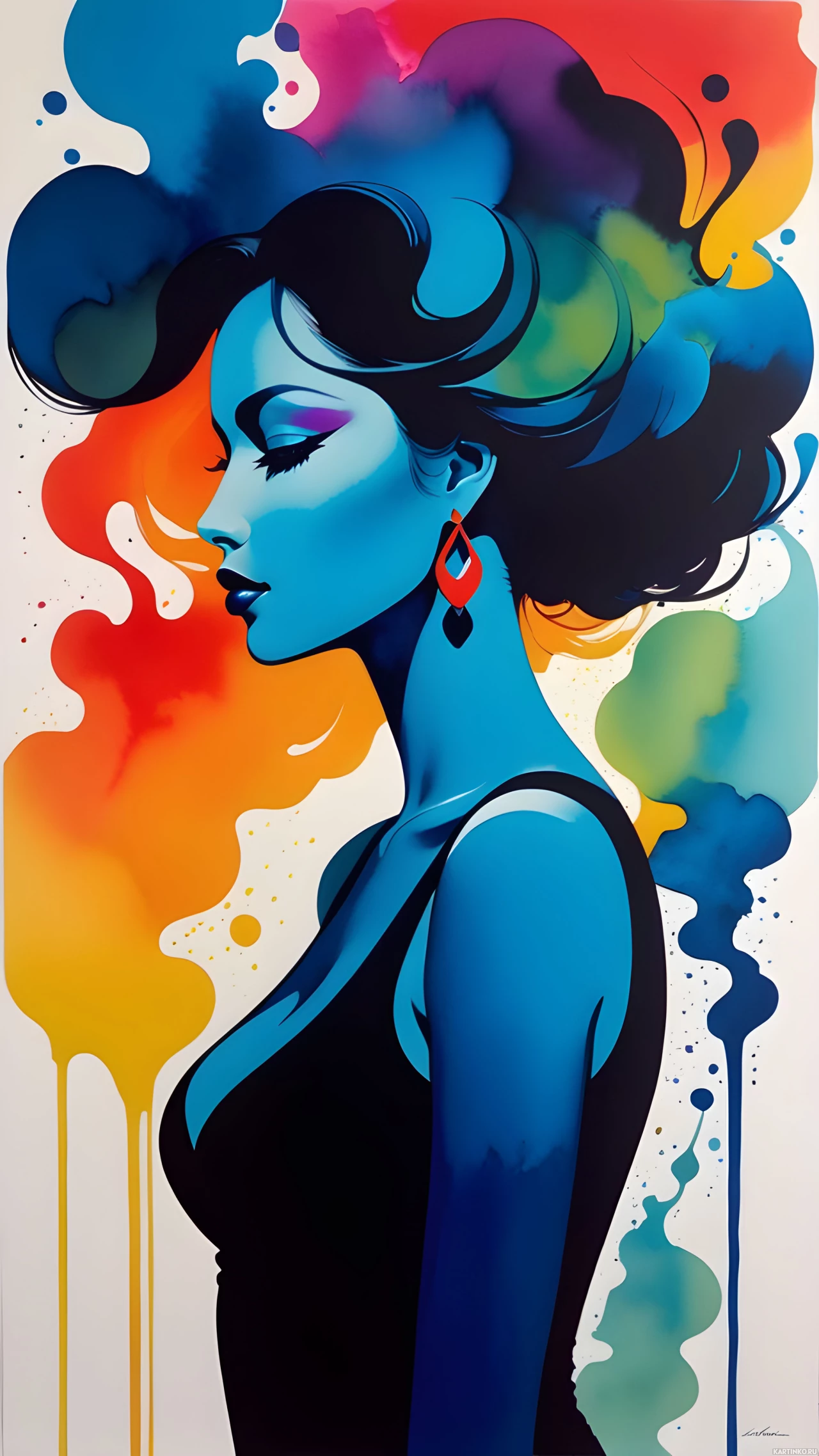 На картинке запечатлён человек с закрытыми глазами, с макияжем, включающим синие и чёрные оттенки на лице и шее. У него длинные волосы, окрашенные в цвета, перекликающиеся с цветовой гаммой фона. Фон состоит из ярких брызг краски разных цветов — красного, жёлтого, оранжевого, розового, зелёного и многих других. Общий стиль картинки тяготеет к художественному или концептуальному, с акцентом на насыщенные цвета и выразительный макияж.