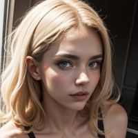 In the image, there is a young woman with light-colored hair and striking blue eyes. She has her lips slightly parted in a natural pout. The woman is wearing a black sports bra that accentuates her midriff. She's seated on what appears to be a kitchen countertop or table, which provides a stark contrast with her light complexion against the dark surface. Her pose suggests a casual yet poised attitude. Her gaze is directed straight at the camera, giving a sense of connection with the viewer.