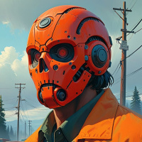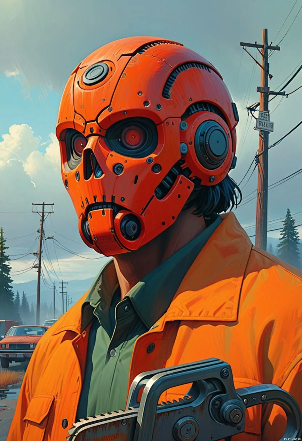 На картинке изображен персонаж в оранжевом шлеме с красными и черными деталями, напоминающим череп со светящимися глазами. Шлем соединен с конструкцией, похожей на механическое устройство, на плечах человека. На нем оранжевая куртка, а на лбу – солнцезащитные очки. На заднем плане – сельский пейзаж с деревьями и линиями электропередач на фоне чистого неба.