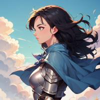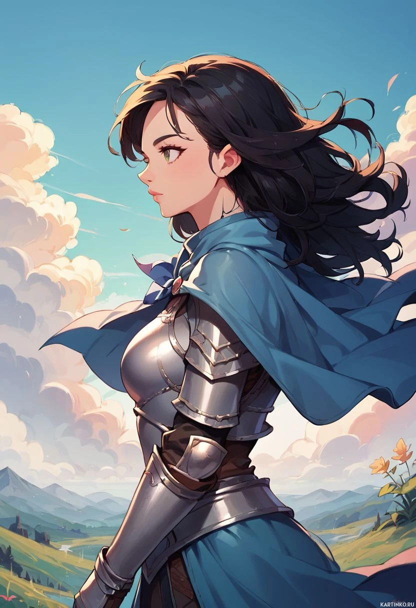 a blue cloak or cape, which adds to her fantasy-like appearance. Her attire suggests she might be a warrior or knight of some sort, given the armor. In the background, there's
