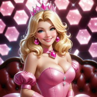 The image features a character depicted as a princess with blonde hair, wearing a pink dress that suggests royalty. She has a smiling expression and is adorned with a crown on her head. Her pose and attire are reminiscent of Princess Peach from the video game series Super Mario Bros., with certain iconic elements such as the tiara and crown being noticeable. The character is seated in a throne-like chair, suggesting regal status.