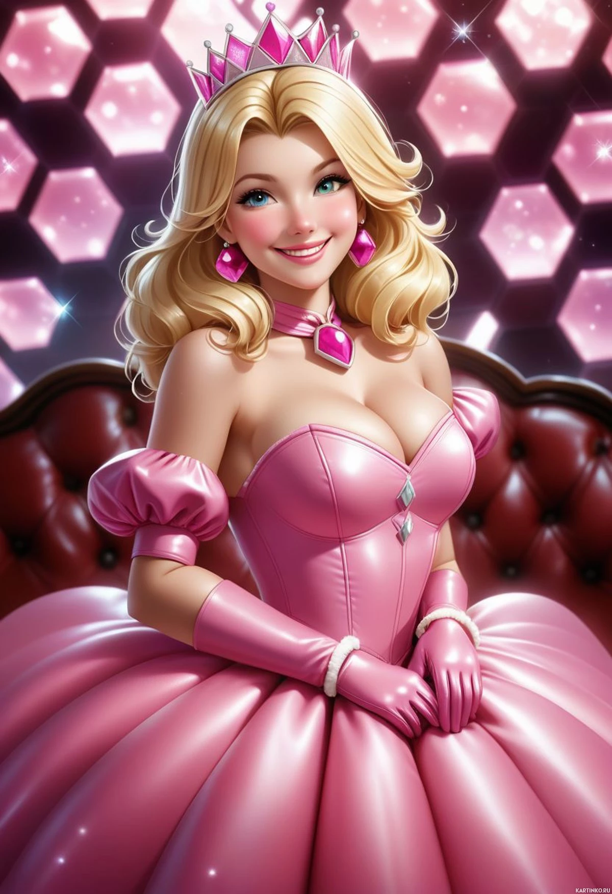 На картинке изображена героиня, похожая на принцессу с золотистыми волосами в розовом платье, подчеркивающем её царственное происхождение. У неё улыбка и на голове корона. Поза и наряд напоминают принцессу Пич из видеоигры Super Mario Bros., заметны такие характерные детали, как тиара и корона. Героиня сидит на троне, что подчеркивает её высокое положение.