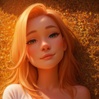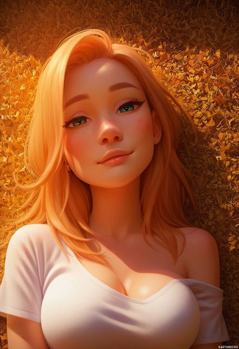 Цифровая иллюстрация молодой девушки с светлыми волосами, голубыми глазами и невинным выражением лица. На ней белая блузка. Фон выполнен в тёплых тонах, вокруг головы девушки разбросаны оранжевые камни или кристаллы.