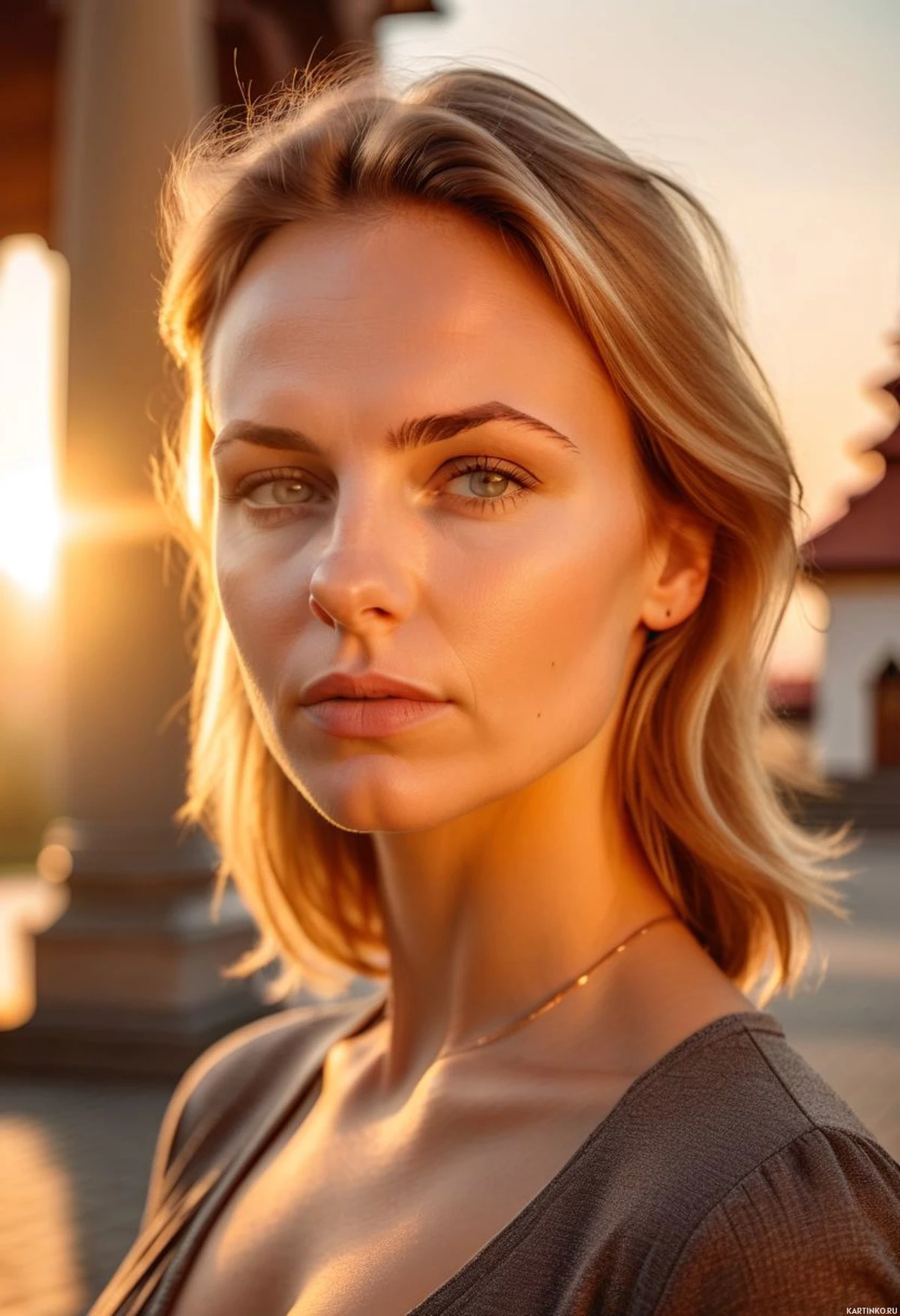 На картинке запечатлена женщина с невыразительным лицом, смотрящая в камеру. У нее светлая кожа, и кажется, она слегка отвлекла взгляд влево, от зрителя. Волосы уложены в легкие волны, ниспадающие чуть ниже плеч. У нее аккуратные брови, а макияж включает четкий контур глаз и губ. На ней безрукавный наряд, возможно, топ или платье с V-образным вырезом, серого цвета, что может говорить о трикотажной фактуре. Освещение наводит на мысль, что фотография сделана на закате или рассвете, так как теплые тона освещают ее лицо и плечи. Фон мягко размыт, что указывает на возможное нахождение на открытом воздухе с элементами архитектуры, но конкретные детали не различимы из-за акцента на главном объекте.