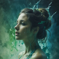 The image features a woman with her head turned to one side, looking off into the distance. Her facial expression appears contemplative or thoughtful. She has long dark hair and is wearing a sleeveless top that's drenched with blue fluid, which is splashing onto her shoulders and back. There are also green droplets around her head, possibly indicating motion or a dynamic process at work. The background suggests a space or environment with light effects, like sparkles, adding to the fantastical or artistic nature of the image.