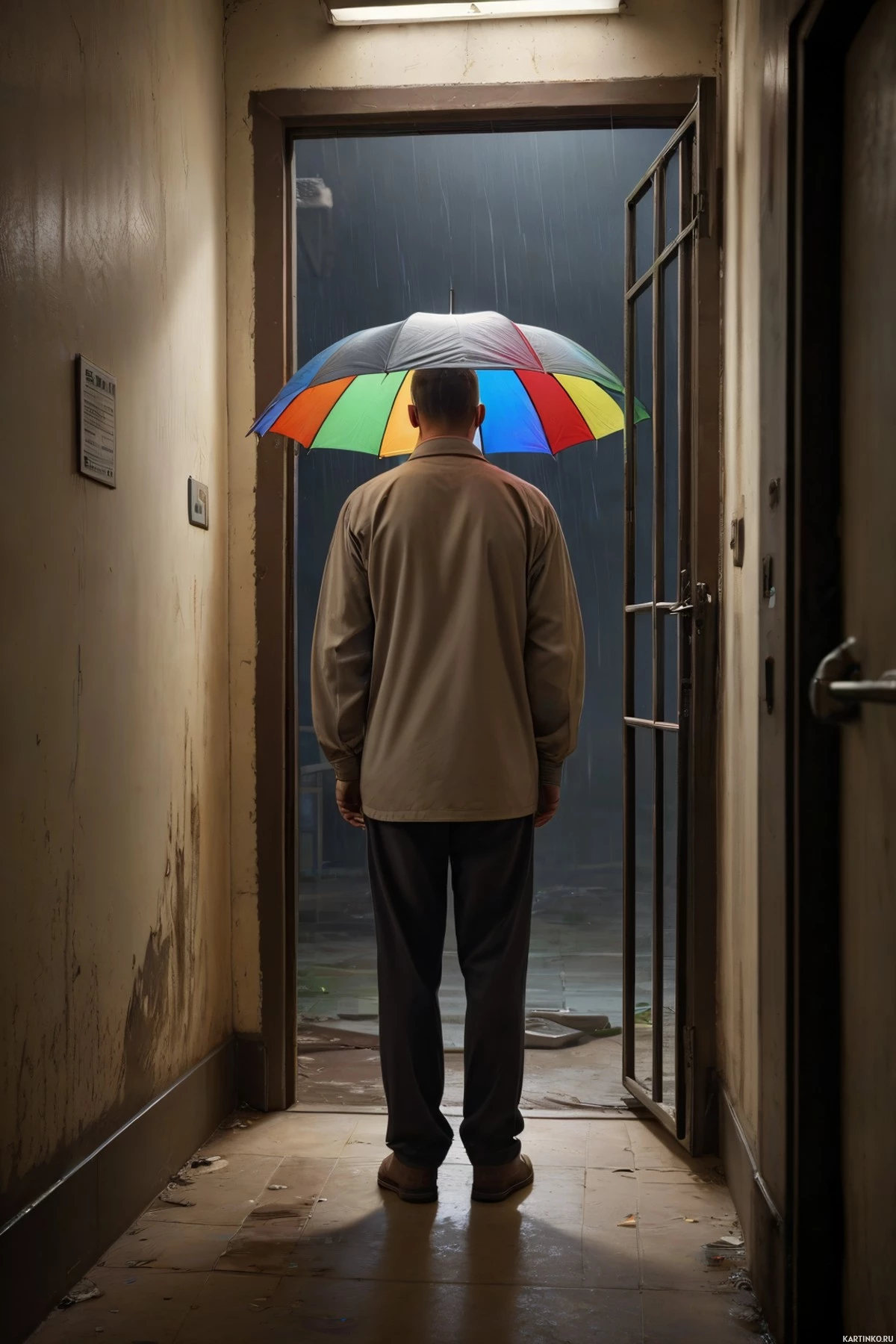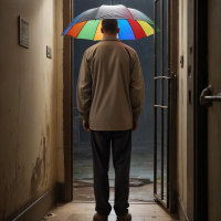 На картинке мужчина стоит в открытой дверном проёме ночью. Мы видим его со спины, он смотрит в тёмную комнату. В руке у него разноцветный зонт, словно он только что вошёл или готовится к дождю. Освещение и композиция создают загадочную атмосферу.