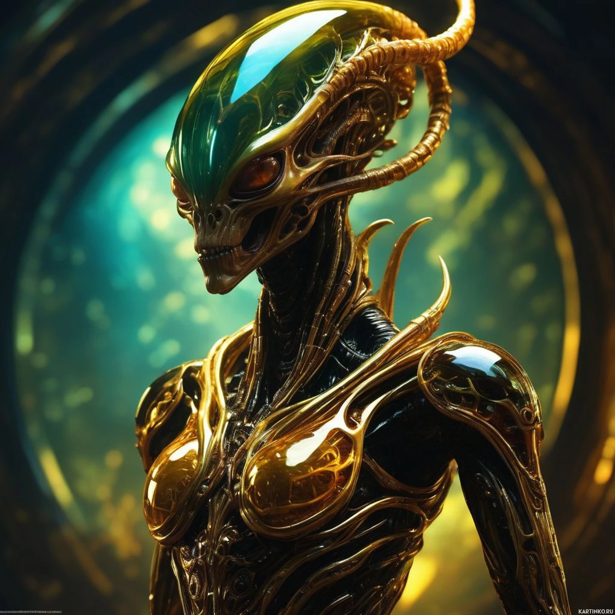 The image presents a science fiction depiction of an alien entity. At the center stands an anthropomorphic figure with a humanoid body structure, but with distinct non-human features. The head appears to be that of a creature, possibly a reptilian or snake-like entity, with scales and sharp teeth. There is a prominent horn or crest on the top of its head, suggesting an air of dominance or leadership within this alien culture. The body of the alien is covered in intricate mechanical parts, giving it an armored appearance that seems to be both organic and metallic. The color scheme includes shades of green for the scales, black for the skin, and gold for accents on the mechanical parts. The background has a neon glow with abstract designs that hint at a futuristic or advanced technology setting. The overall composition of the image places it firmly within the realm of science fiction art, specifically focusing on the conceptualization of alien life forms and their environments.