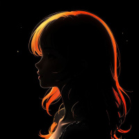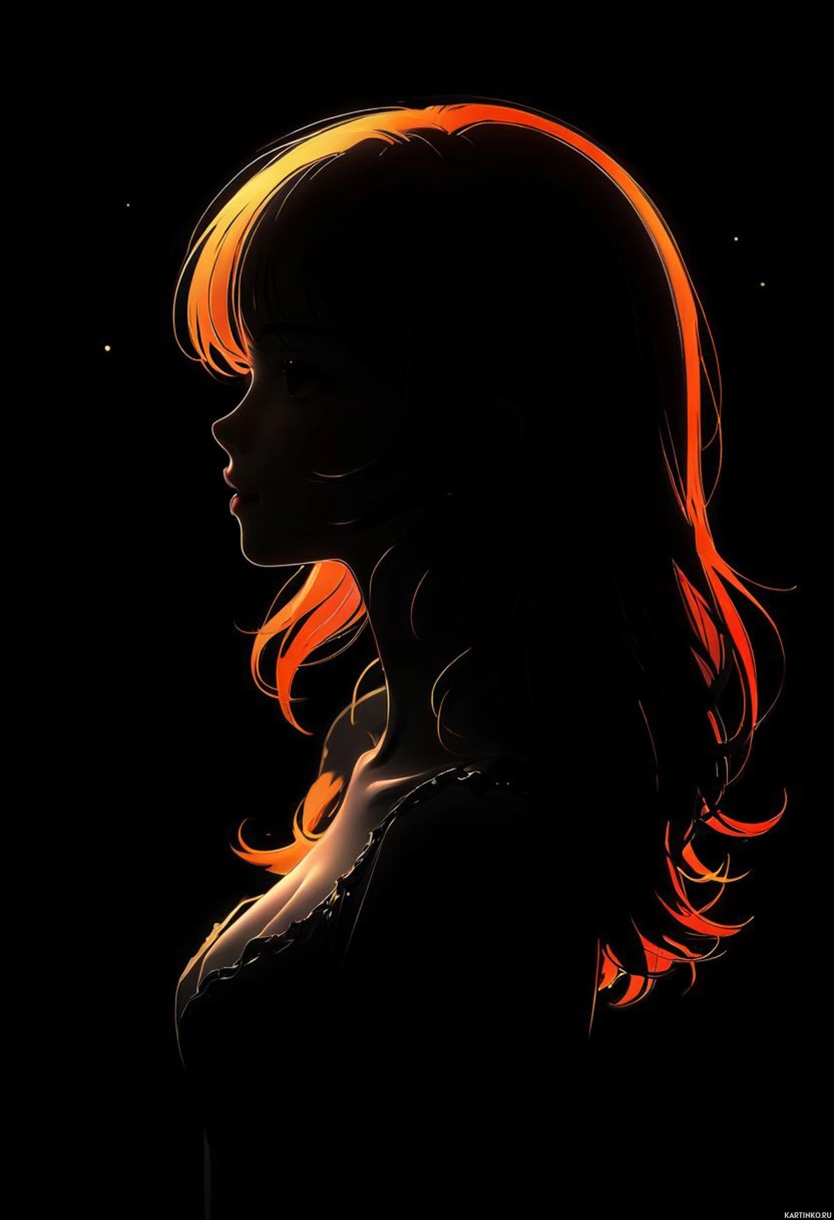 A young woman with vibrant hair, gazing downwards, her lips parted slightly as if she's deep in thought. The silhouette is distinct against a dark background, accentuating the contours of her figure and expression.