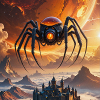 Картинка изображает фантастическую научно-фантастическую сцену: на холме возвышается замок, с видом на обширный пейзаж под драматичным небом, полным облаков и небесных тел. На переднем плане — сложный механический конструкт, похожий на паука, с многочисленными ногами и центральным телом, в котором, кажется, горит красный светящийся стержень. На заднем плане видны пологие холмы, луга и река, извивающаяся к дальнему замку, архитектурно повторяющему замок на переднем плане. Общая атмосфера картинки создает впечатление места действия из высокофантастического или научно-фантастического сюжета.
