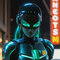 A woman in a futuristic armor with glowing eyes and chest, standing on an urban street at night. She has blonde hair and is wearing fingerless gloves. The armor appears to be made of black material with neon blue accents.