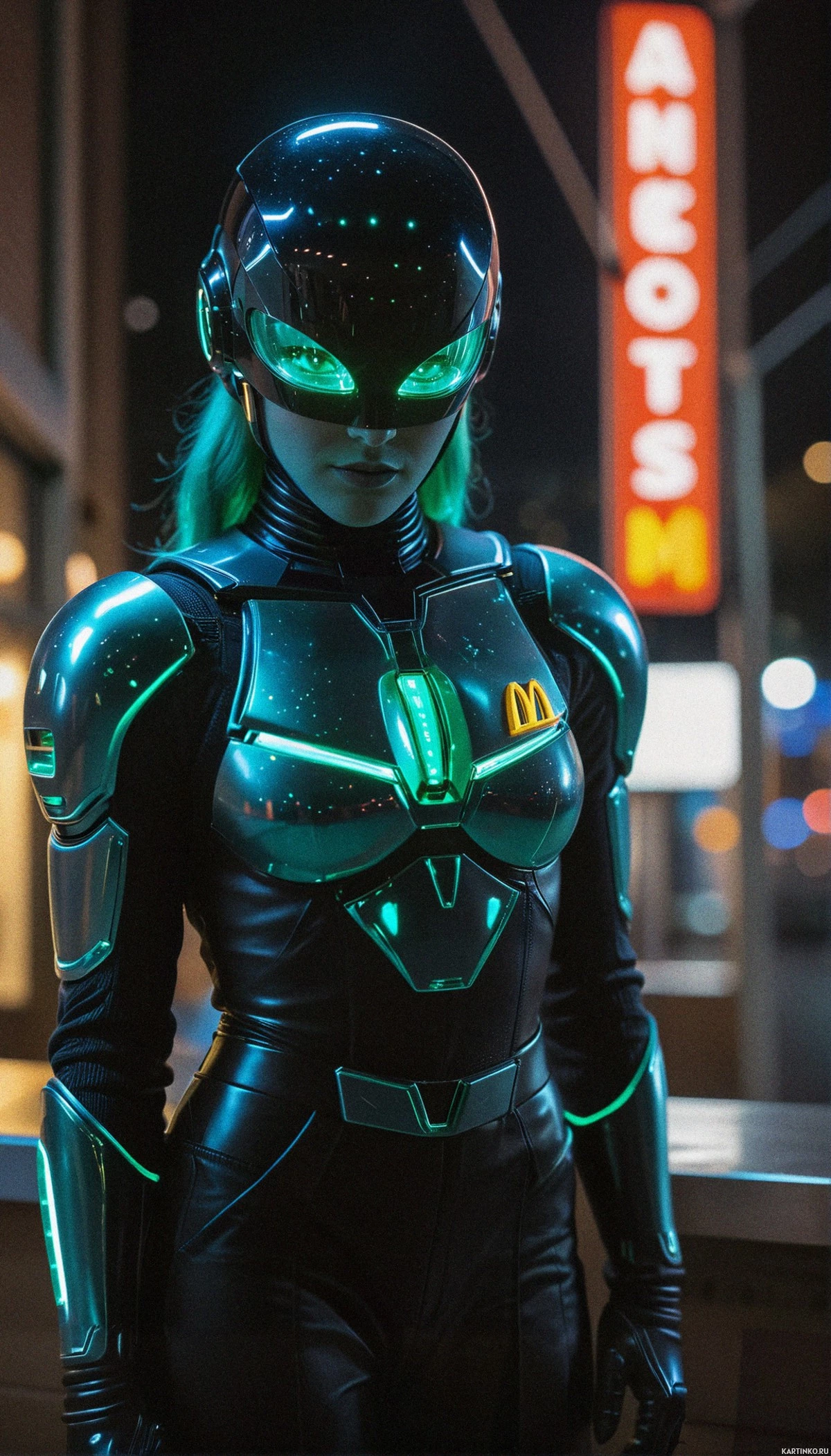 Женщина в футуристических доспехах со светящимися глазами и грудью стоит на ночной городской улице. У нее светлые волосы и она одета в перчатки без пальцев. Доспехи словно сделаны из черного материала с неоново-синими акцентами.