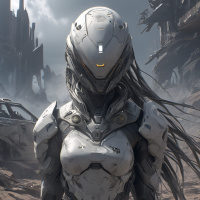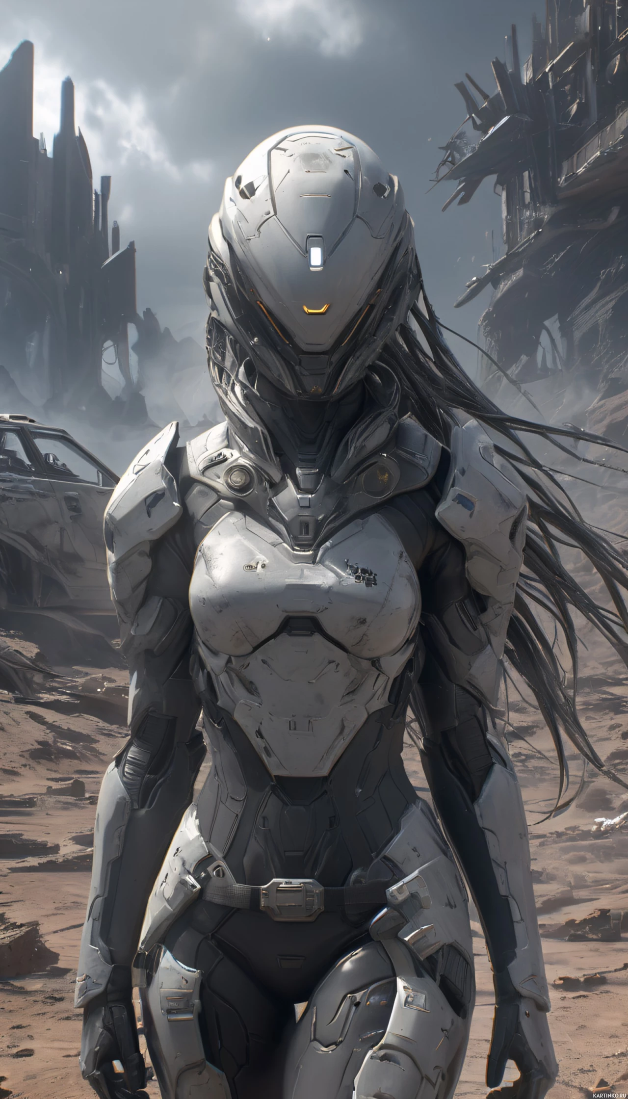 На картинке изображена девушка в футуристических доспехах, стоящая на пустынной местности с каменными образованиями на фоне. На ней шлем, а её наряд включает металлические элементы и механические детали, что указывает на передовые технологии или кибернетику. Её поза – уверенная и властная.