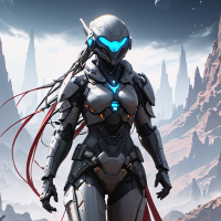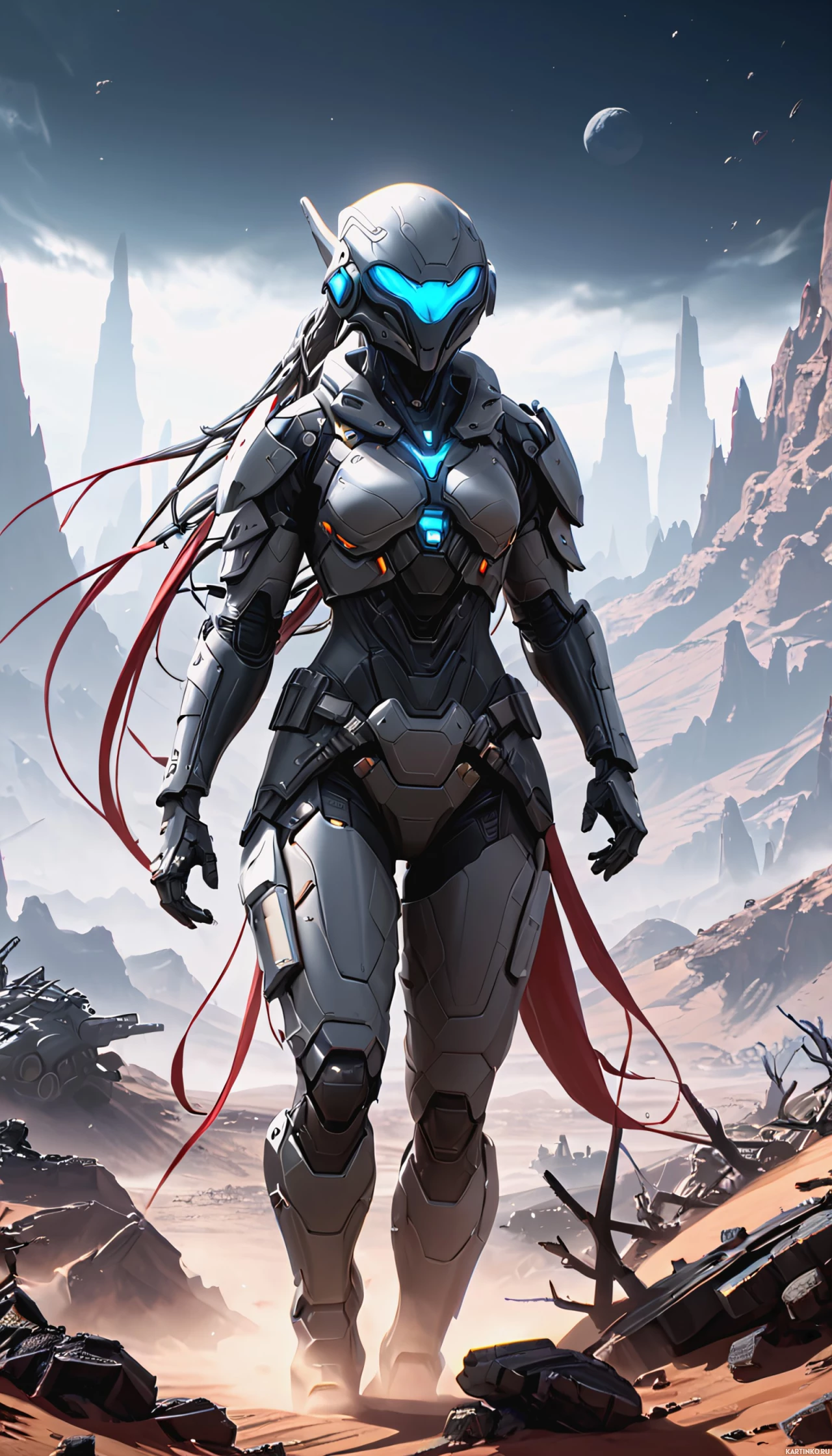 Картинка с человекоподобной фигурой в футуристической броне и шлемом, скрывающим лицо, с рыжими волосами. Она стоит на бесплодной каменистой земле под звёздным небом, на фоне далёких сооружений, похожих на луну или другое небесное тело.