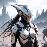 На картинке изображена женская фигура в футуристических доспехах, характерных для научно-фантагенного жанра. У неё длинные каштановые волосы, и на ней шлем с открытым забралом. Доспехи включают в себя нагрудник, наплечники и облегающий комбинезон. Её поза уверенная: одна рука лежит на бедре, другая свободно свисает. Она стоит на каменистой местности, на заднем плане видны скалистые пейзажи, намекающие на внеземную среду. Картинка передаёт ощущение силы и стойкости, что вполне уместно для персонажа в научно-фантагенном сеттинге.