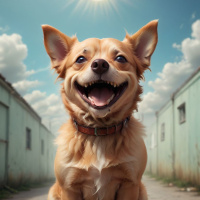 The image features a stylized illustration of a chihuahua sitting on a brick surface with buildings in the background. The dog appears to be looking up towards the sky with a joyful expression, showing its teeth in what could be interpreted as a smile. The lighting suggests it might be late afternoon or early evening due to the angle of the sunlight hitting the scene.