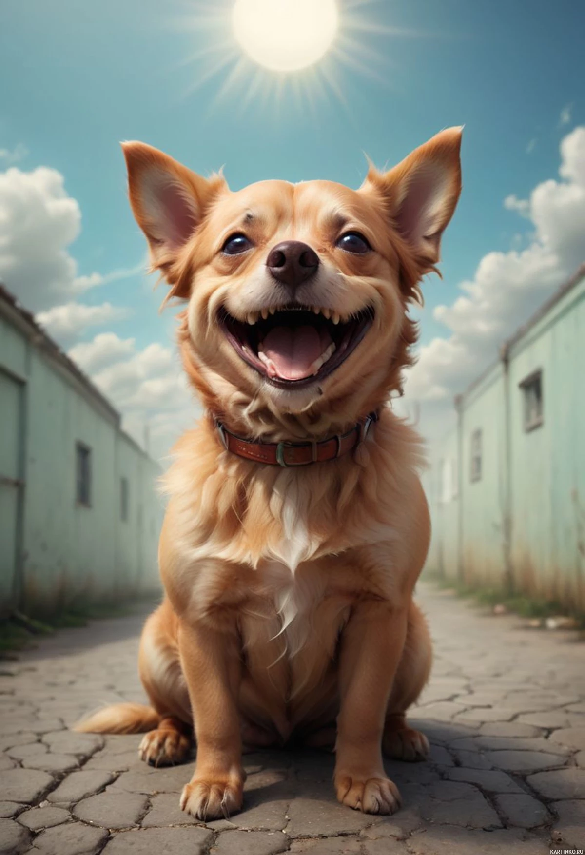 На картинке – стилизованная иллюстрация чихуахуа, сидящего на кирпичной поверхности на фоне зданий. Собака смотрит вверх, к небу, с радостным выражением, показывая зубы, что можно расценить как улыбку. Освещение указывает на то, что это либо поздний вечер, либо ранняя вечерняя пора из-за угла падения солнечного света.