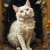 На картинке кот, запечатлён в профиль, повернув голову влево и отводя взгляд от камеры. У него длинная шерсть и заметные белые усы. Он сидит на поверхности, напоминающей камень или бетон, украшенной разбросанными оранжевыми цветами, добавляющими красок в сцену. За котом виднеется арка, сложенная из, по-видимому, старого кирпича, обрамленная зеленью и жёлтыми цветами, образующими полукруглую декорацию. Освещение на фотографии создаёт мягкое свечение по краям, подчеркивая общую безмятежную атмосферу композиции.