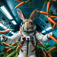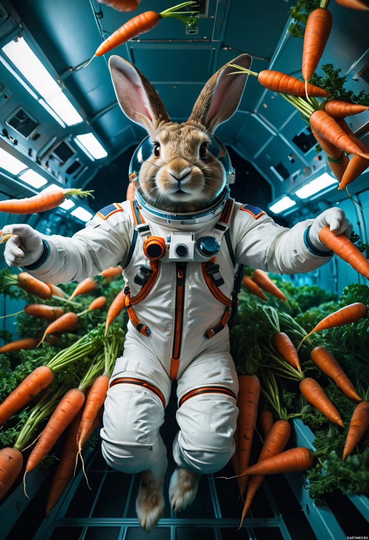 The image features an astronaut with a rabbit's head wearing an astronaut suit in a space environment, which includes plants that resemble carrots. The astronaut is depicted mid-leap or action pose, appearing to interact with the surroundings. The setting seems to be a simulated space environment with artificial plant growth and possibly a spacesuit hatch.