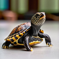 This image depicts a three-dimensional model of a turtle, which appears to be designed with realistic details including the texture of its shell and patterns on its back. The turtle is positioned facing towards the right side of the image, giving it a sense of movement forward. It is placed on what looks like a reflective surface, possibly water, given the way light is being refracted. The overall style of the image suggests it may be used for illustrative or educational purposes.