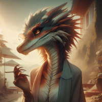 На картинке изображено антропоморфное существо с человеческой фигурой и признаками дракона. У него человеческое лицо с заострёнными ушами, изящный нос, большие выразительные глаза и широкая улыбка. Тело покрыто чешуёй, а длинный хвост тянется до пола. Правая рука поднята ко рту, словно он держит сигарету или стакан с водой. Существо, похоже, сидит на краю бассейна на фоне заката, судя по тёплым цветам в заднем плане. Задний план составляют элементы классической архитектуры – колонны и арки.