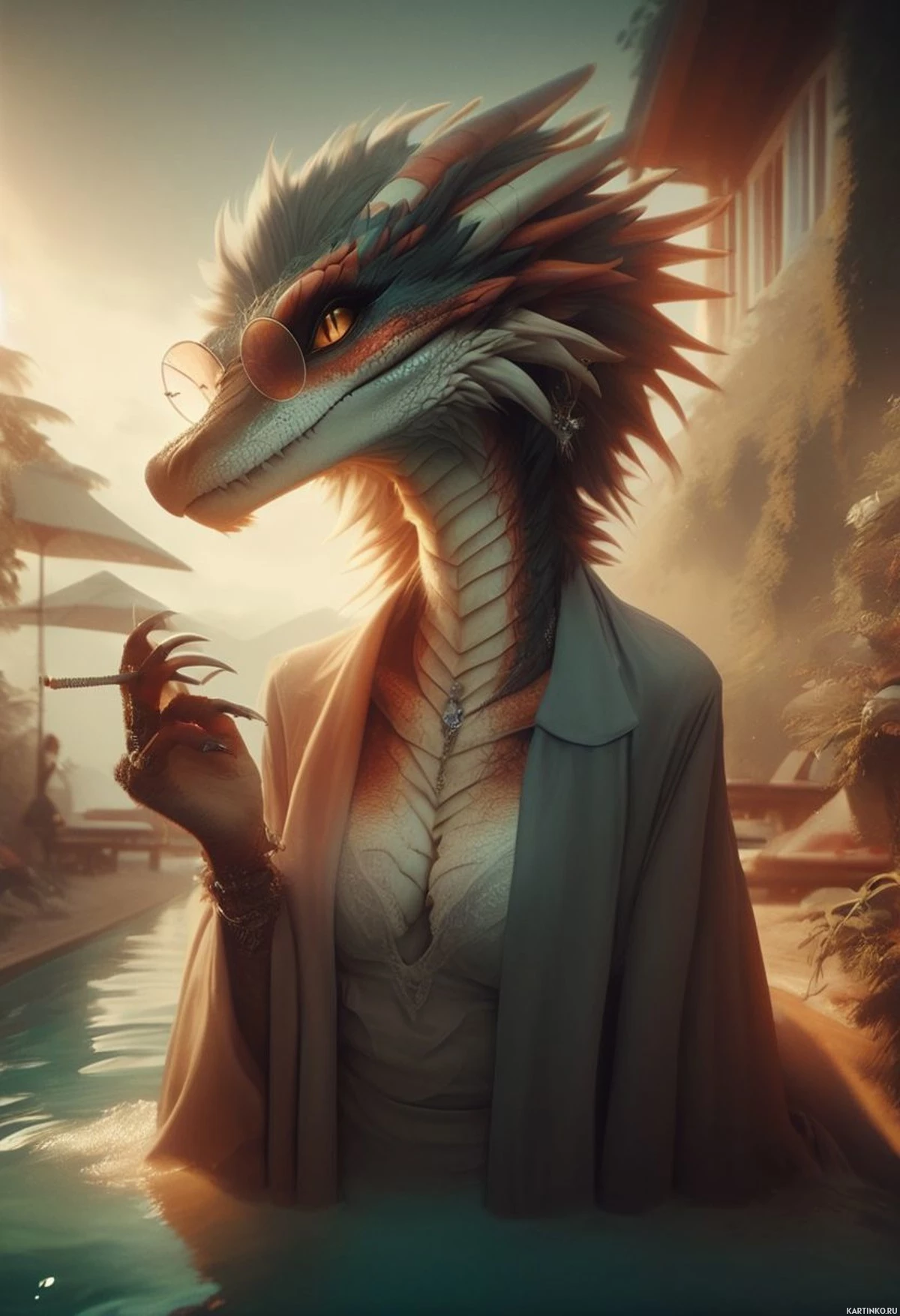 The image features an anthropomorphic creature with a humanoid form and features of a dragon. It has a human-like face with pointed ears, a slender nose, large expressive eyes, and a wide mouth. Its body is covered in scales, and it has a long tail extending to the floor. The creature's right hand is raised to its mouth as if holding a cigarette or a glass of water. It appears to be sitting on the edge of a swimming pool at what looks like sunset due to the warm colors in the background. The scene is set against a backdrop of a building with classical architectural elements, such as columns and arched windows.