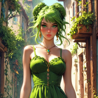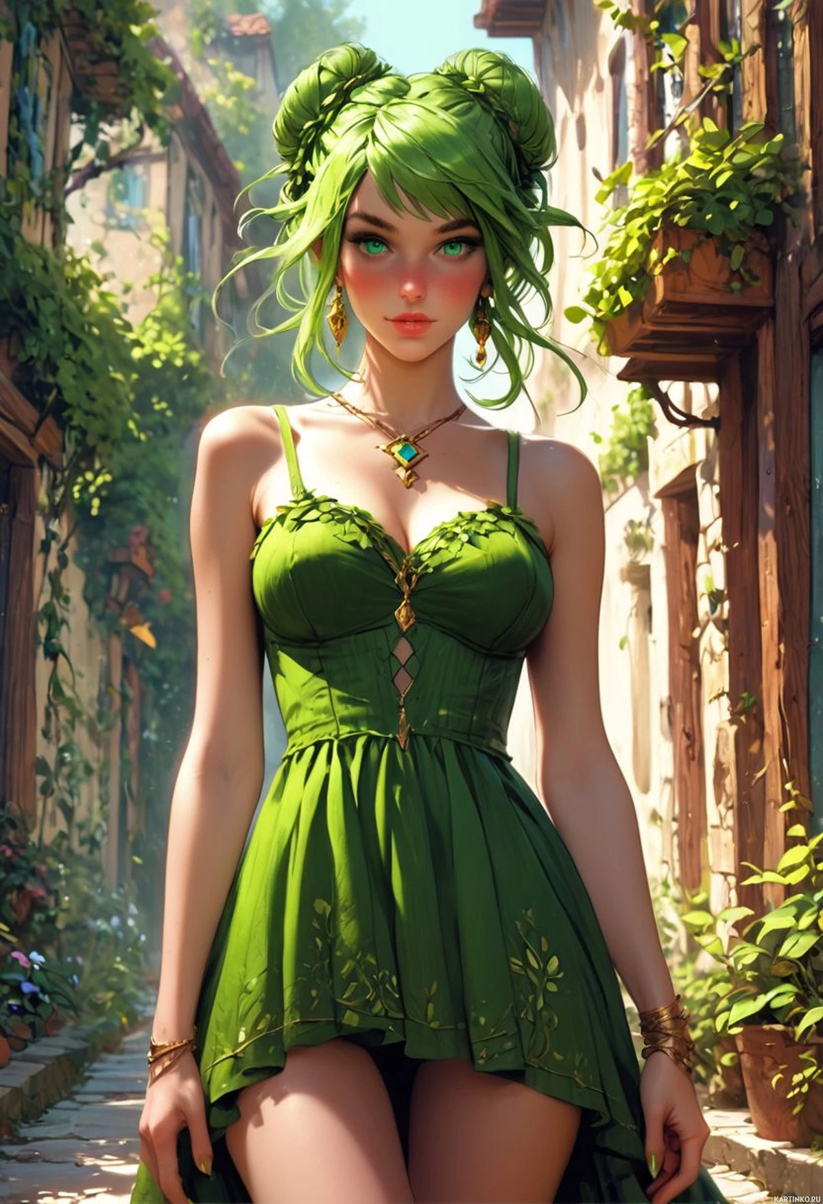 female character with green hair, wearing a green dress. She has an ornate necklace and is depicted in a three-