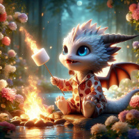 The image depicts a fantasy scene featuring a dragon-like creature with prominent horns and wings, sitting by a bonfire that emits a warm orange glow. The creature is anthropomorphic in appearance, as it holds a lit candle on its tail using the other end, which looks like a hand. It's wearing what appears to be traditional or ceremonial clothing with intricate patterns and designs. Surrounding the creature are various flowers and foliage, contributing to a magical forest setting. The overall atmosphere of the image is whimsical and magical.
