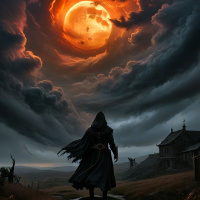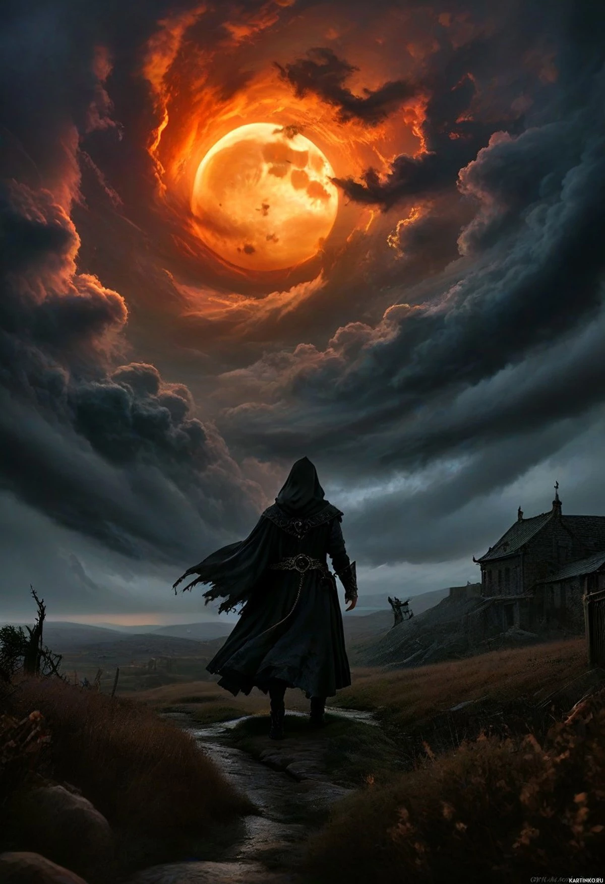 На картинке запечатлена фантастическая сцена, увиденная от лица человека в плаще с капюшоном. Он смотрит вправо, где небо бушует огромными облаками, а ярко-красная Луна нависает над ним. На переднем плане, слева, притаился уютный домик среди деревьев, а оттуда, с места, где стоит фигура, ведёт тропинка. На заднем плане – открытое поле, поросшее редкой растительностью. Вся картинка пропитана таинственной и мрачной атмосферой, словно она взята из страниц сказочного мира.