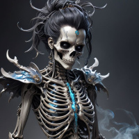 This image features a figure that appears to be a skeleton with a humanoid form, adorned in a fantasy-themed outfit. The skeleton has a detailed appearance with muscles and tendons visible on the body, including the neck where the head is missing. It's wearing what looks like armor or arm covers that have spikes or protrusions along the edges. A blue light emanates from the chest area, suggesting some form of energy or life force. The skeleton has a hand that seems to be holding a piece of paper, although the contents are not visible. The overall style of the image is artistic and evokes a sense of fantasy or otherworldly powers.