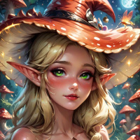 The image depicts an illustrated character that appears to be a fantasy-style elf with blonde hair, wearing a pointed witch hat and what seems to be a costume or armor. The character is set against a backdrop that includes mushrooms and a forest atmosphere, suggesting a magical setting often associated with elves in fantasy genres.
