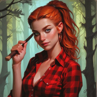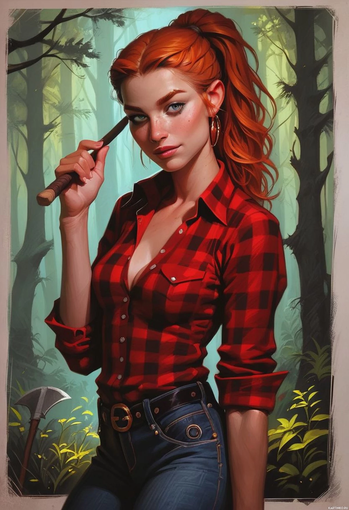 The image features a female figure prominently positioned in the center. She has red hair tied back and wears a plaid shirt, jeans, boots, and is holding what appears to be an axe with her right hand. Her gaze is directed towards something or someone out of frame. The background suggests a fantasy setting with verdant vegetation and a mysterious forest environment.
