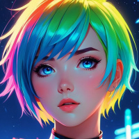 The image features an illustrated character that appears to be a young girl with stylized features. She has vibrant hair, which transitions from blue at the top to green and then to yellow, giving her a unique and colorful appearance. Her eyes are a striking shade of blue. The character is wearing what seems to be futuristic or cyberpunk-inspired attire; it's sleek and black with metallic accents. The background has a starry night sky effect, which suggests that the character might be located in outer space or within a science fiction context. There are also faint silhouettes of what look like celestial bodies or planets visible in the distance, contributing to the cosmic theme of the image. The artwork is vivid and detailed, showcasing digital art skills.