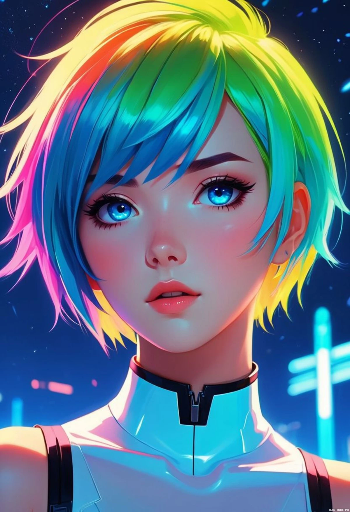 На картинке изображен персонаж, похоже, молодая девушка со стилизованными чертами. У нее яркие волосы, переливающиеся от синего у корней к зеленому и затем к желтому, что придает ей неповторимый и красочный вид. Ее глаза — поразительного синего цвета. На персонаже — одежда, выполненная в футуристическом или киберпанк-стиле: гладкая, черная с металлическими вставками. Фон представляет собой эффект звездного ночного неба, что наводит на мысль, что персонаж может находиться в космосе или в научно-фантастическом сеттинге. Вдали видны едва различимые силуэты, похожие на небесные тела или планеты, подчеркивающие космическую тематику картинки. Работа выполнена в яркой и детализированной технике цифрового искусства.