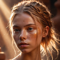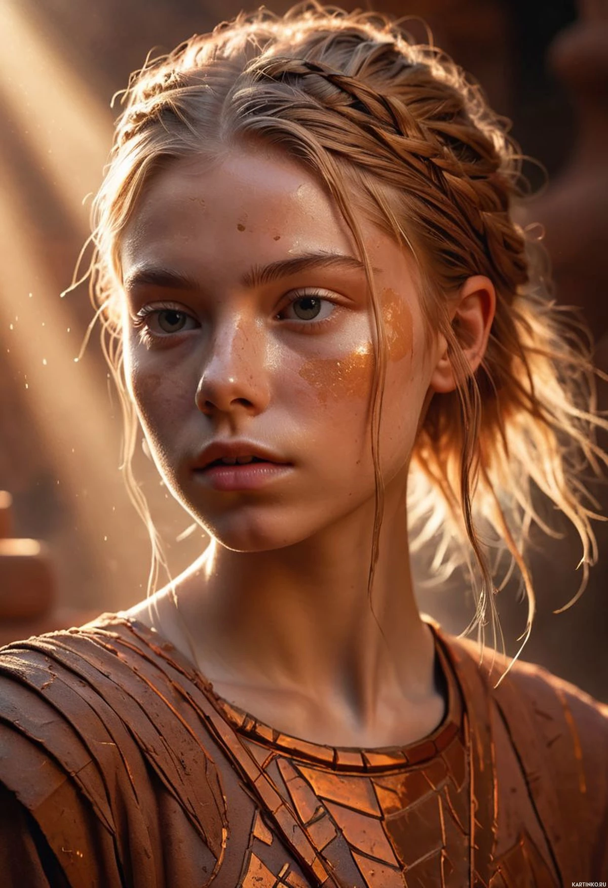 На картинке изображена молодая женщина со светлой кожей и длинными волнистыми светлыми волосами. Её глаза закрыты, выражение лица серьёзное и задумчивое. На щеках и вокруг глаз заметен лёгкий макияж, подчеркивающий тени на лице. Губы слегка приоткрыты, будто она собирается что-то сказать или только что закончила говорить. На ней золотисто-коричневый корсет с замысловатыми узорами, напоминающими доспехи или церемониальный наряд. Корсет украшен оборками у плеч и, кажется, изготовлен из блестящего материала, возможно, кожи или металла. Тёмный пояс подчёркивает талию, намекая на то, что это часть костюма. Её кожа видна над корсетом, и на ней нет другой верхней одежды, которая обычно сопровождала бы такие доспехи. Освещение на фотографии подчёркивает её черты тёплыми тонами, отбрасывая мягкие тени на лицо и верхнюю часть шеи. Фон размыт, но указывает на интерьер с деревянными балками и, кажется, лестницей или приставной лестницей, уходящей вверх за пределы кадра. Фокус и композиция позволяют предположить, что это может быть кадр из фильма или высококачественная рекламная фотография.