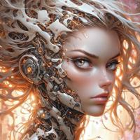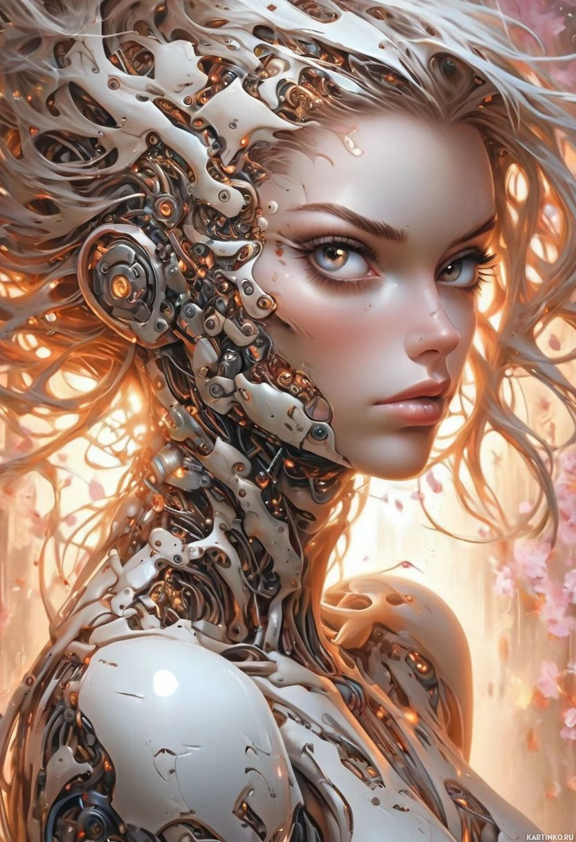 cherry blossoms and what appear to be petals scattered around her head, adding a touch of nature to the otherwise technologically advanced image. The overall style of the artwork suggests a blend of organic beauty with high technology, often associated with