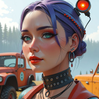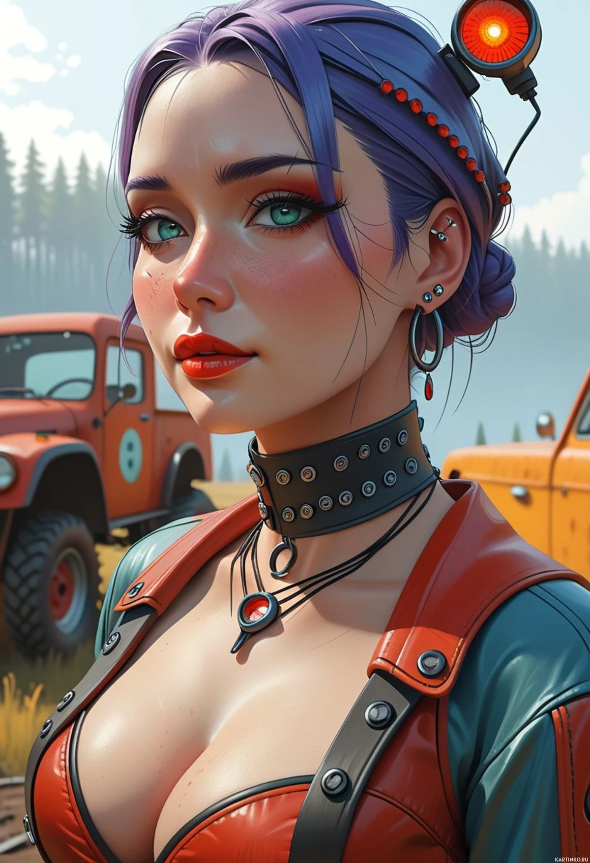 На картинке изображена девушка с фиолетовыми волосами, уложенными в стиле, намекающем на панк или готику. У нее яркие голубые глаза и насыщенный макияж: темный карандаш, драматичные тени и красная помада. На девушке множество пирсинга и серьги с изображением черепа. На ней кожаная куртка, украшенная шипами, что подчеркивает ее дерзкий образ. На заднем плане виднеется поле с грузовиками вдалеке, что говорит о том, что действие происходит на открытом воздухе, возможно, в игровом мире.