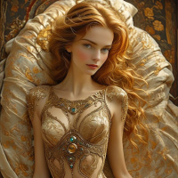 На картинке изображена женщина с длинными рыжими волосами, лежащая на спине. На ней роскошный металлический костюм золотистого цвета с замысловатыми узорами, полностью покрывающий тело. Её взгляд направлен вверх, к зрителю, выражение лица нейтральное. Вокруг неё – богатые ткани в золотистой гамме, создающие ощущение роскоши и исторической эпохи.
