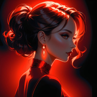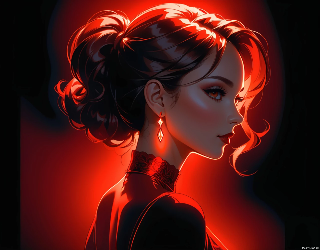 На картинке – цифровая иллюстрация девушки с рыжими волосами, собранными в высокую причёску. На ней, похоже, красное платье с тёмными аксессуарами. Выражение её лица нейтральное, взгляд направлен на зрителя. За головой – красный фон, словно излучающий свет. Цветовая гамма картинки тёплая, преобладают оттенки красного.