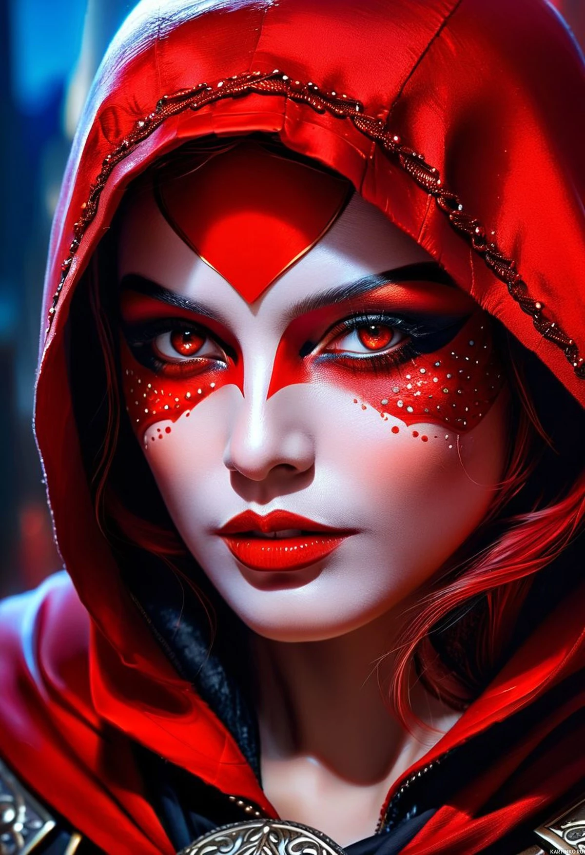 The image features a character with red hair wearing a black hood with red accents and a heart-shaped symbol on it. The face is detailed, showcasing red eyeshadow and what appears to be blood droplets or paint around the lips and eyes. The background is dark and has abstract elements that give off a cyberpunk vibe.