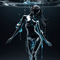 На картинке изображена центральная фигура, похожая на человеческую, стоящая на отражающей поверхности. Фигура имеет металлический, блестящий вид, что может говорить о ее металлическом составе или об искусственной художественной росписи с глянцевым эффектом. Вокруг фигуры видны капли воды, указывающие на недавний контакт с ней. Фон темный, что создает контраст с фигурой и подчеркивает ее отражающие свойства. Пол под фигурой черный, возможно, тоже влажный от той же воды, которая образовала лужицы вокруг нее. Это художественная работа с налетом сюрреализма.