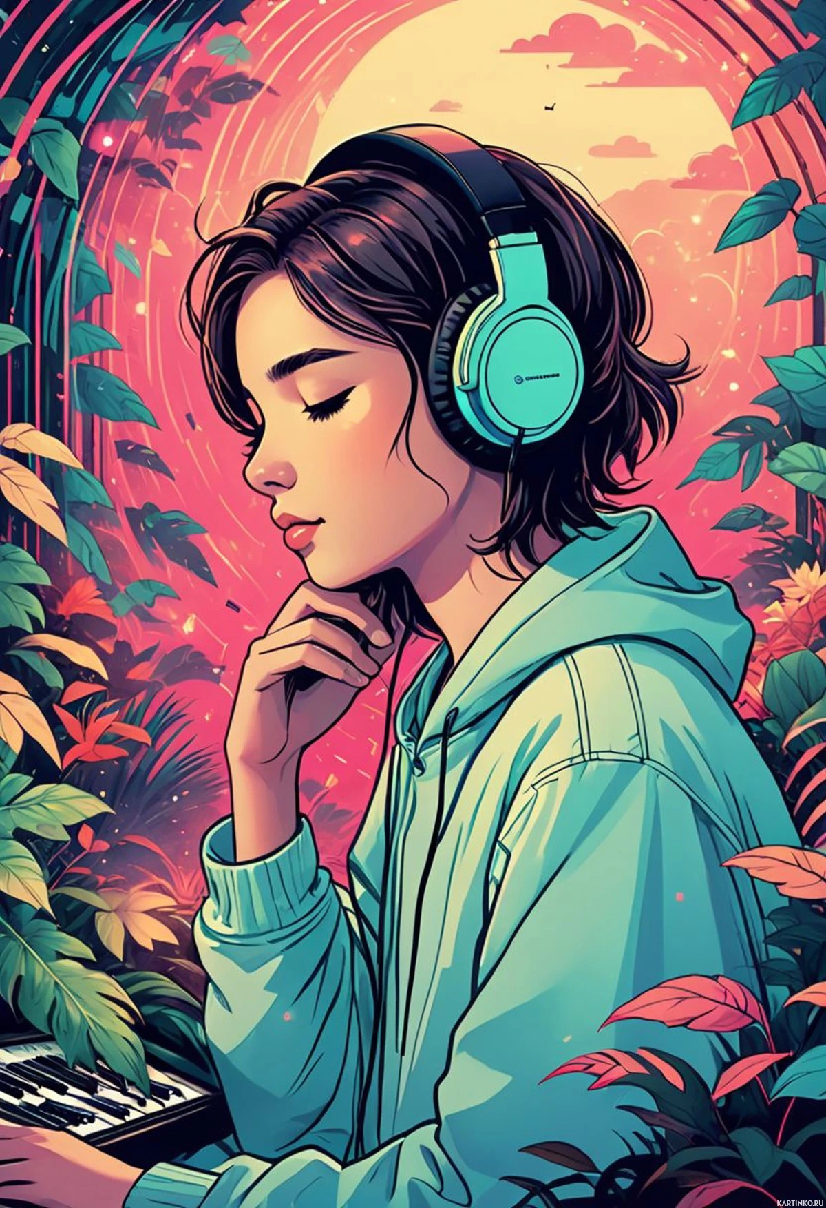 На картинке молодая женщина с темными волосами сидит за роялем. У нее закрыты глаза, и она слушает музыку в наушниках. Сцена фантастическая: на заднике – огромная луна и пышная зелень.