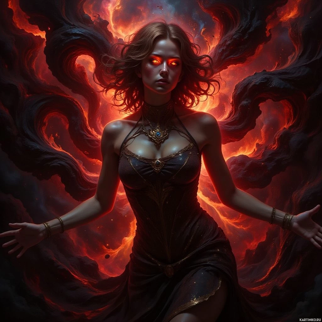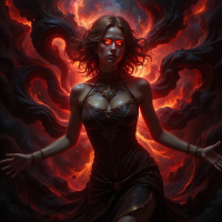 brown hair that falls around her shoulders. Her expression is intense, with her eyes looking upwards and her mouth slightly open, suggesting determination or power. The character stands against a backdrop of fiery elements, including what appears to be flames surrounding her lower body and hands. The central motif in the background consists of two large, serpentine horns-like forms with