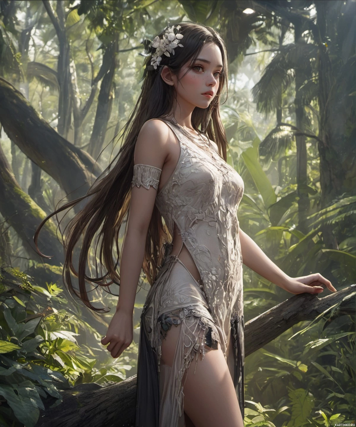 На картинке – брюнетка с короткой стрижкой сидит на пне в лесу. На ней сложный костюм, включающий платье и декоративную головную убор, что намекает на сказочную или историческую тематику. Девушка смотрит на зрителя с лёгкой улыбкой, её поза расслабленная, но изящная. На заднем плане – пышная зелень, характерная для густого леса, и лёгкая дымка, скрывающая дальние части сцены, создающая таинственную атмосферу.