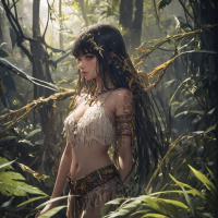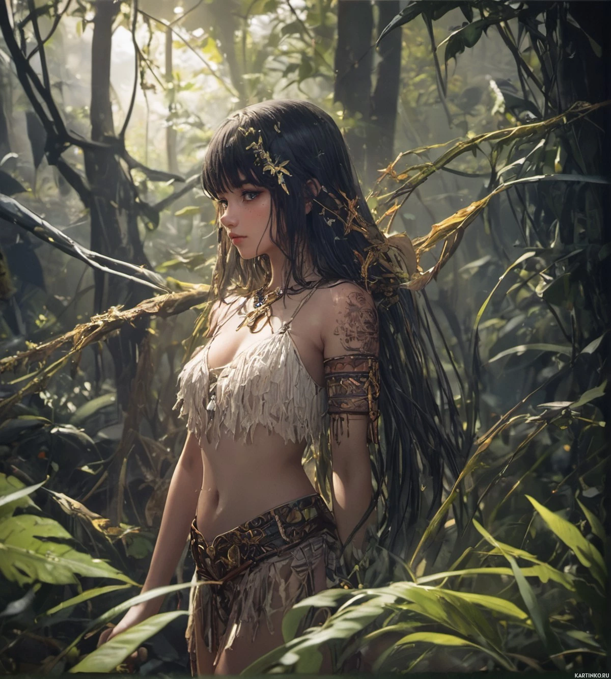 На картинке запечатлена молодая женщина с темными волосами, стоящая в густом лесу. На ней традиционный племенной наряд, украшенный перьями и, по всей видимости, племенными украшениями или доспехами. Её поза говорит о настороженности и возможной готовности к бою или передвижению. Окружающая листва пышная и густая, что указывает на богатую природную среду.