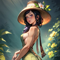 The image features a female character who appears to be in a fantasy setting. She has dark hair and wears a large straw hat with what seems like a flower adornment on the right side. Her attire consists of a top with an exposed back and green pants, suggesting a design that is practical for movement or combat. She is holding a sword in her right hand, which she grips by its hilt. The character's expression is serious and determined. Behind her, there appears to be a lush environment with tropical vegetation such as palm leaves and possibly banana plants. There are also elements that suggest a jungle or wilderness setting, like mist or perhaps the early morning dew on the foliage. The style of the image is characterized by high-quality digital art, featuring vivid colors and detailed textures, which gives it an almost three-dimensional appearance. The lighting in the scene creates a dramatic effect with shadows and highlights that give depth to the environment and the character.
