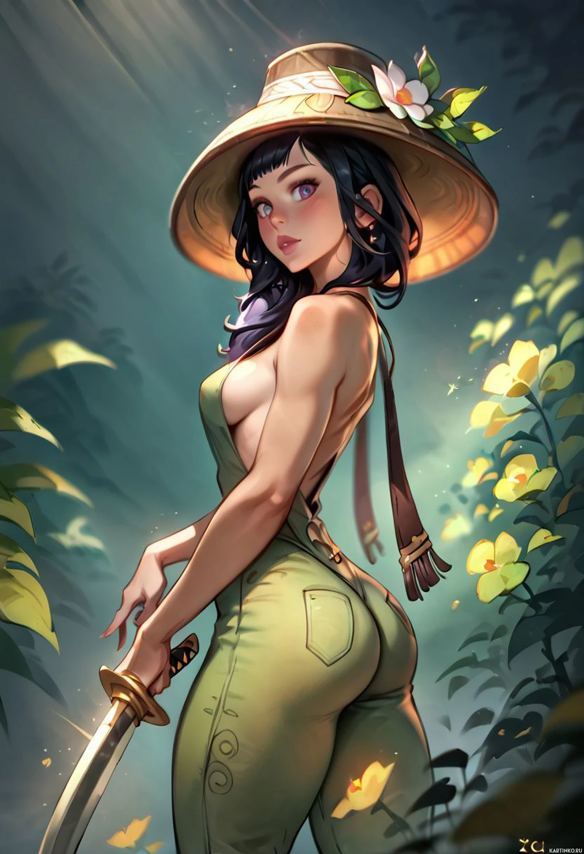 На картинке изображена героиня, похоже, из фэнтезийного мира. У нее темные волосы и большая соломенная шляпа с цветочным украшением сбоку. На ней топ с открытой спиной и зеленые штаны, что говорит о практичном дизайне, подходящем для движения или сражения. Она держит меч в правой руке, крепко сжав его за рукоять. Выражение лица у героини серьезное и решительное. На заднем плане — пышная растительность: пальмы, возможно, банановые деревья. Также присутствуют элементы дикой природы, такие как туман или утренняя роса на листьях. Картинка выполнена в технике цифрового искусства высокого качества, с яркими цветами и детализированными текстурами, что придает ей почти трехмерный вид. Освещение создает драматический эффект с тенями и бликами, которые добавляют глубину окружению и героине.