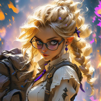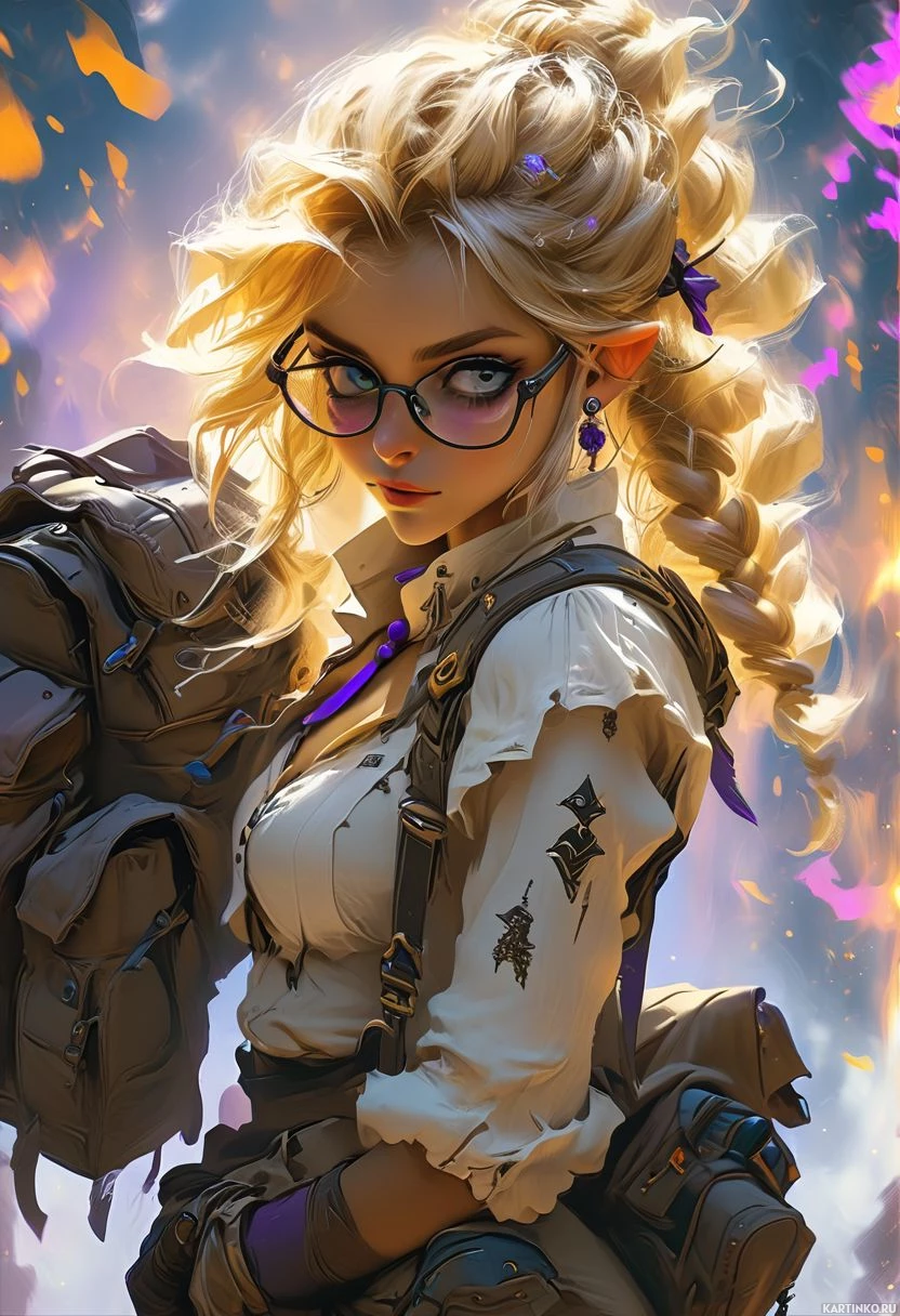 The image features a female character with blonde hair styled in loose waves. She wears glasses and has a neutral expression on her face. Her attire includes a vest, which appears to be made of leather or a similar material, adorned with purple accents that might be jewelry or accessories. The style of the image is artistic with vibrant colors, particularly around the edges where there are sparkles and what seems to be a magical or fantastical effect. She's holding an object in her hand that resembles a book or a journal. The background has a dark and moody ambiance, providing contrast to the character's brightly lit figure.