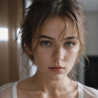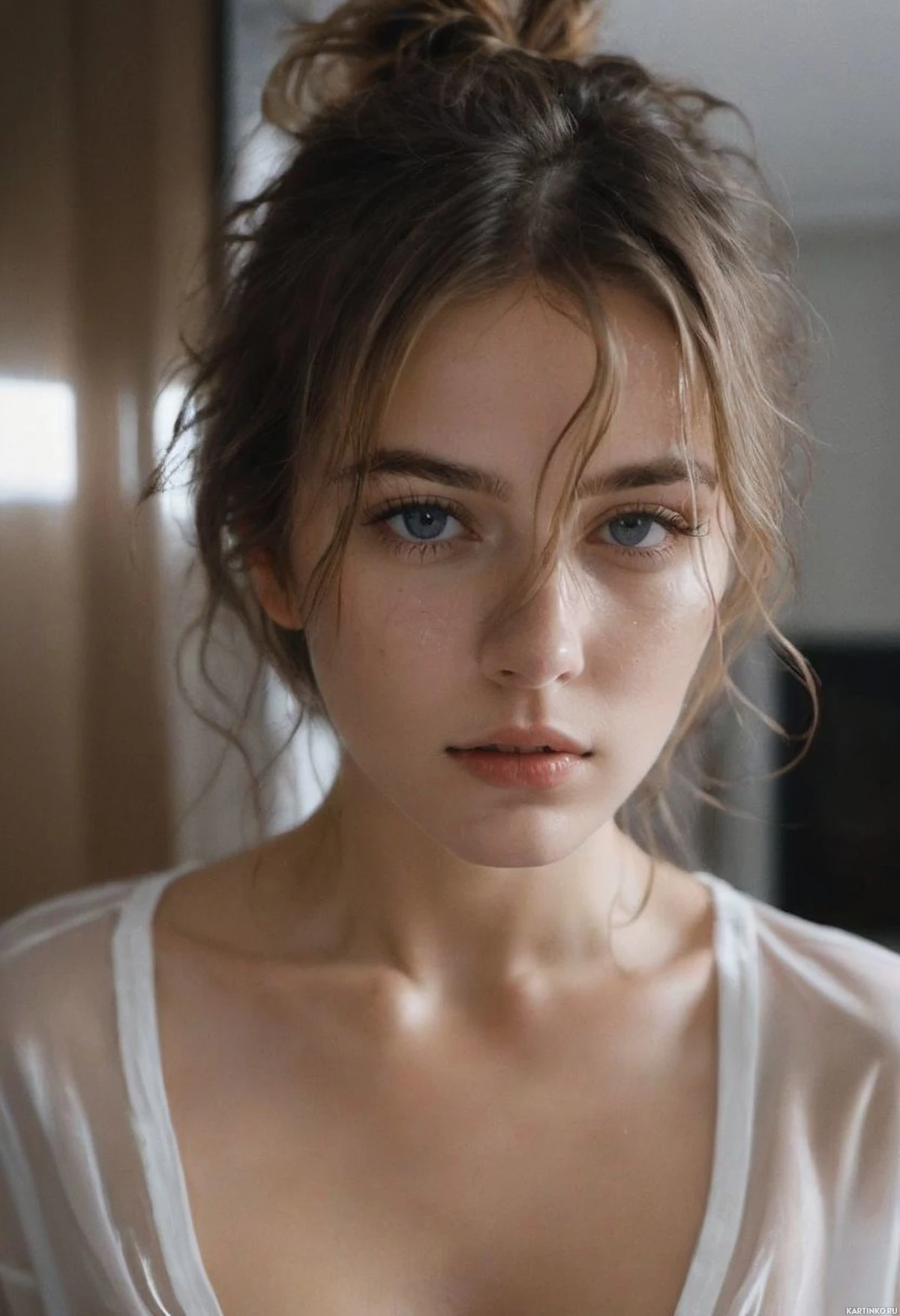 На картинке запечатлена молодая женщина, смотрящая прямо в камеру с мягким выражением лица. Её волосы собраны в высокую причёску, а макияж включает чётко очерченные брови и тени, делающие её голубые глаза особенно выразительными. У неё светлая кожа и небольшие розовые точки на щеках, возможно, от румян или естественного румянца. На ней прозрачный топ с открытыми плечами и тонкими бретельками, ткань кажется полупрозрачной. Её ключицы видны благодаря прозрачности одежды. Фон нечёткий, что указывает на возможное внутреннее помещение, возможно, комнату с мягким освещением.