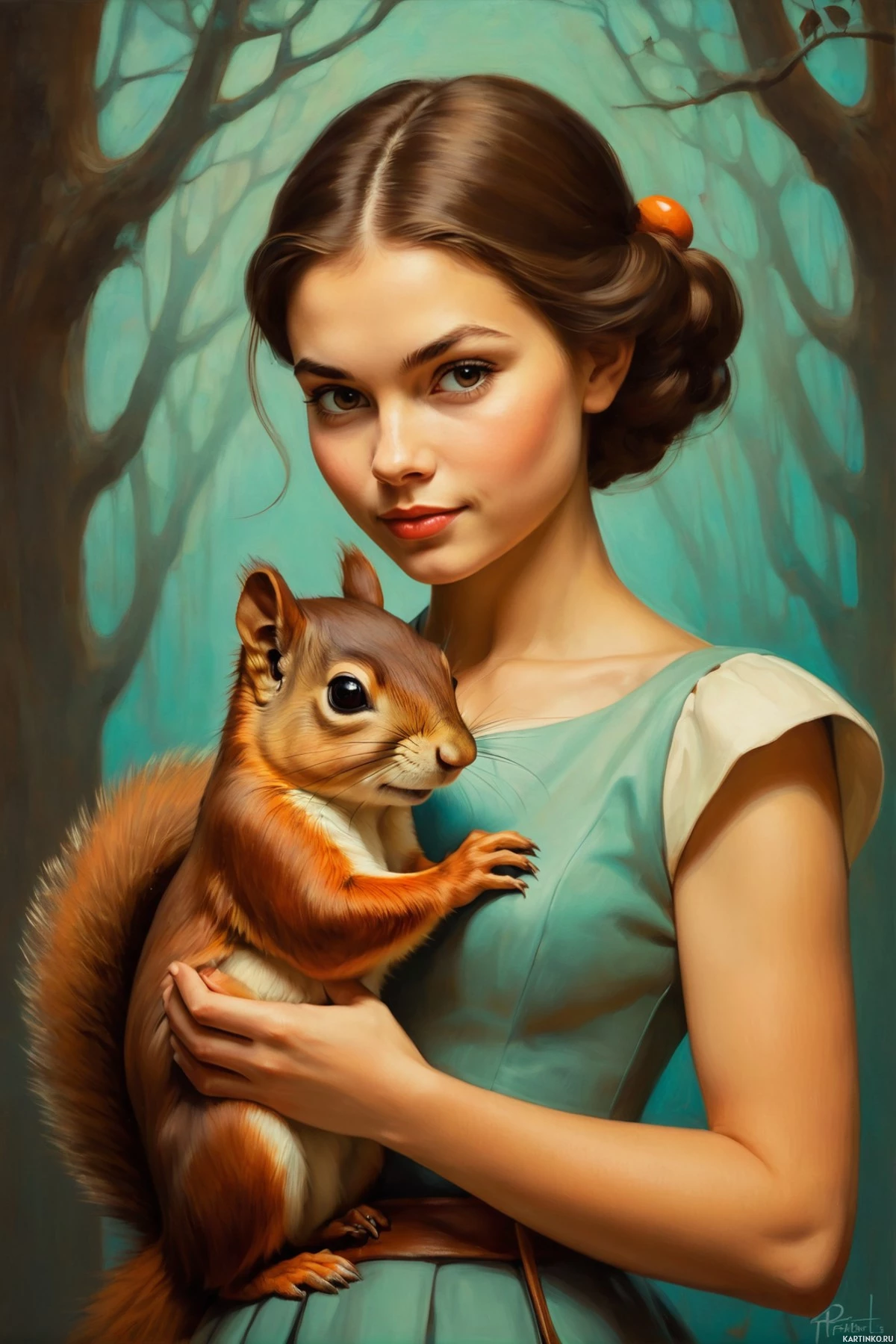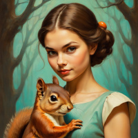 На картинке молодая женщина со светлой кожей и голубыми глазами держит в руках маленького бельчонка. Шерстка у бельчонка насыщенного коричневого цвета. У женщины длинные тёмные волосы, забранные от лица. На ней платье без рукавов, переходящее от зелёного внизу к белому сверху, и светлая голубая повязка на голове. Фон картинки – волшебный лес с высокими стройными деревьями, тянущимися к небу нежно-голубого цвета. Общий стиль картинки напоминает сказку или фэнтезийное искусство, вызывая ощущение магии и очарования.