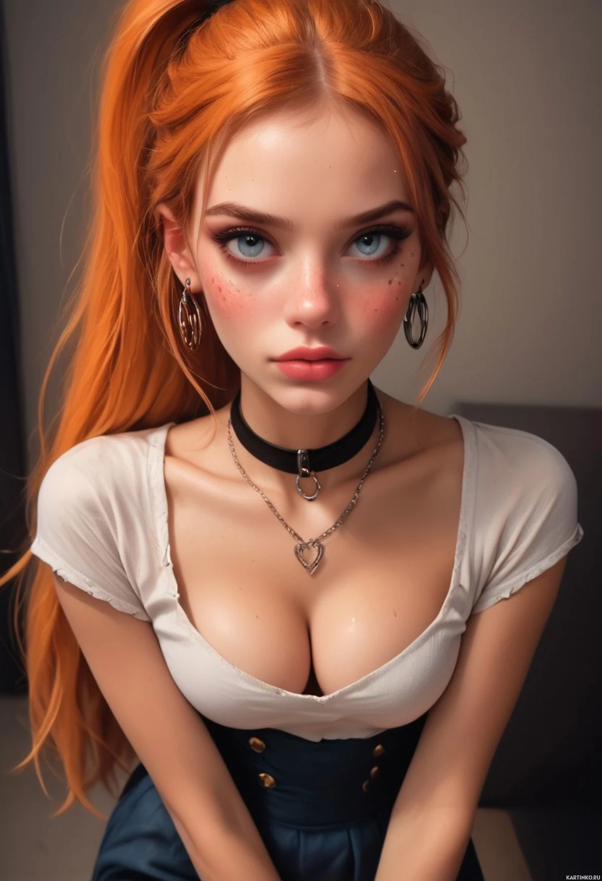 На картинке изображена девушка с рыжими волосами, уложенными в пучок с челкой. У нее макияж, включая темную помаду и, кажется, подводку для глаз или тени. Видны серьги на обоих ушах. Она одета в черный кружевной бюстгальтер и топ с воланами на рукавах. На шее – украшение-чокер с кулоном в виде сердца. Фон размыт, но предполагает интерьер в нейтральных тонах. Освещение мягкое и акцентирует внимание на лице.